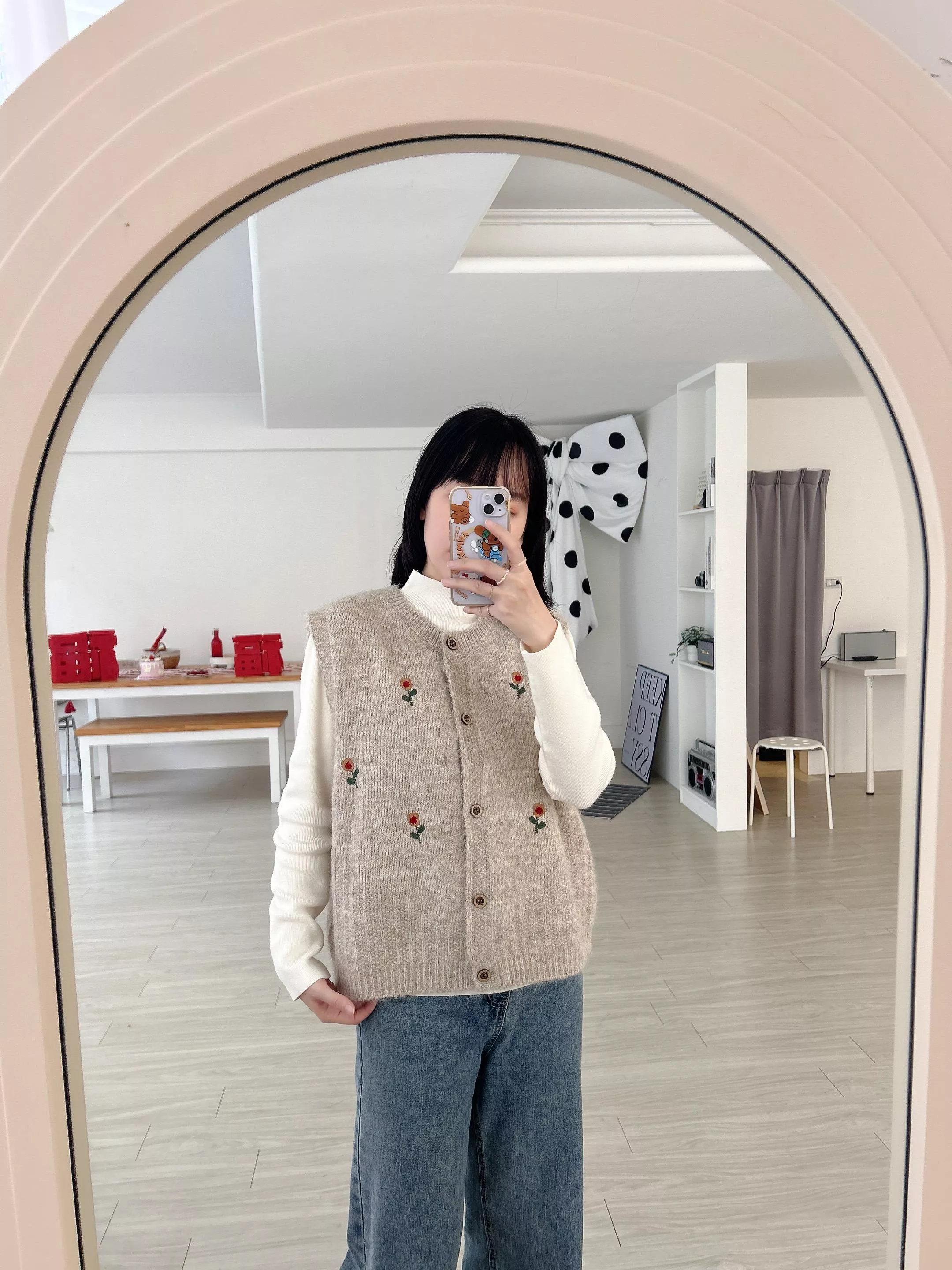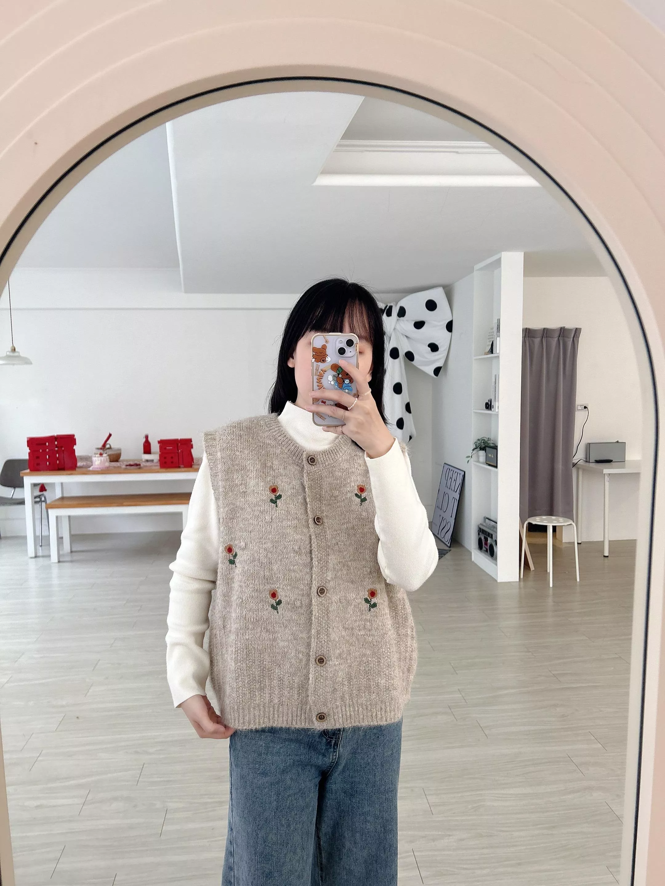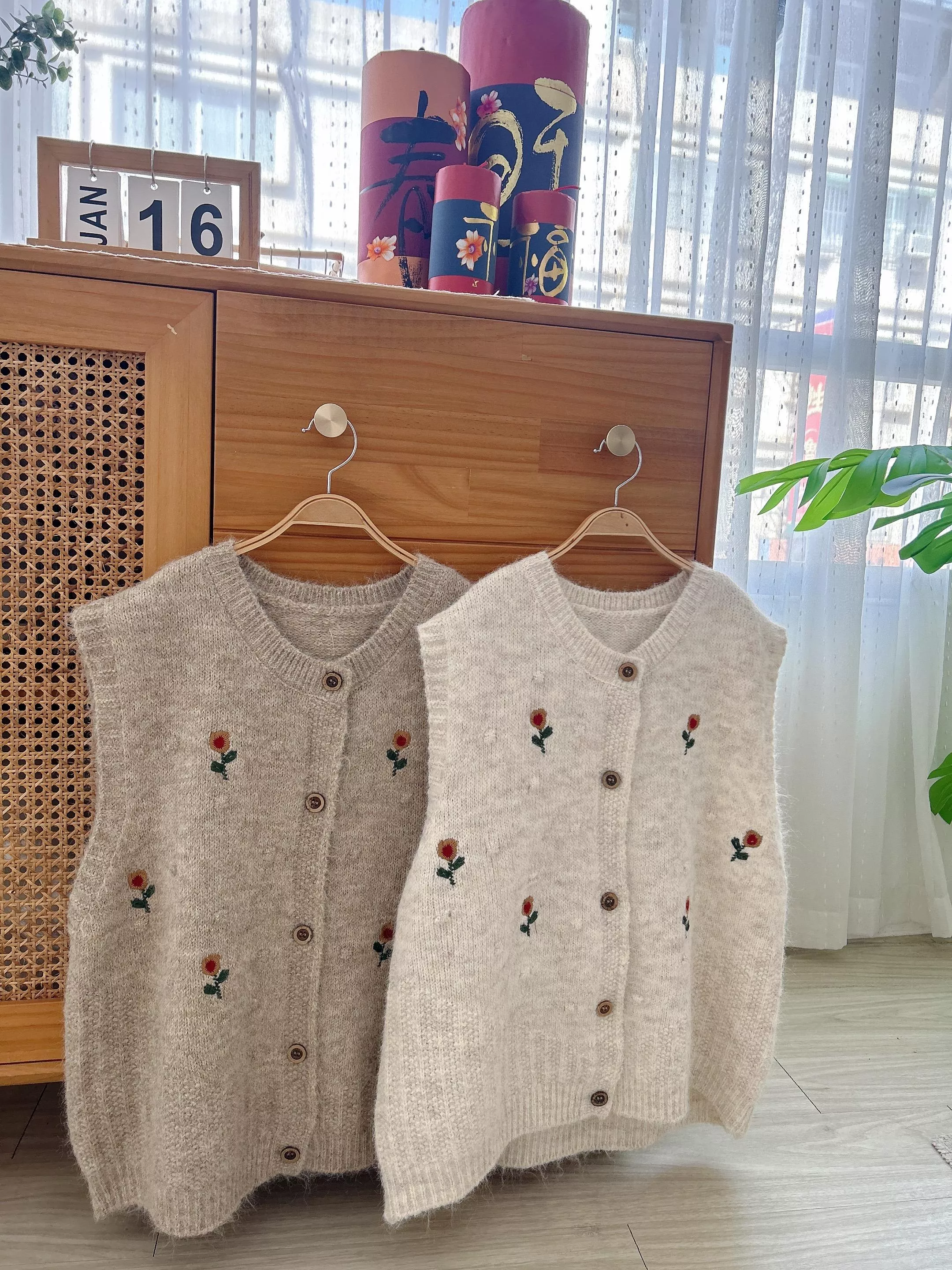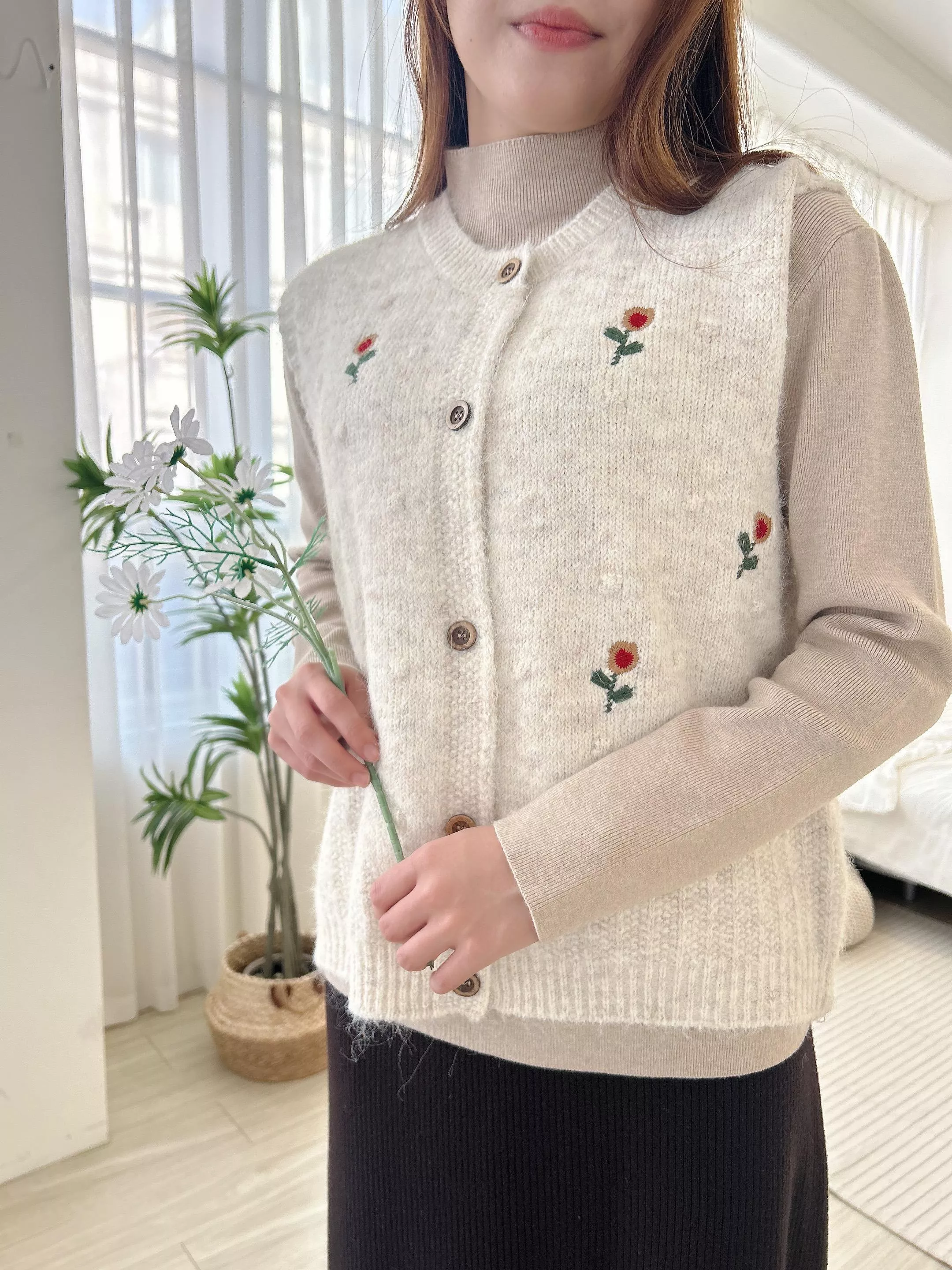 日系小花刺繡木釦針織背心 (2色)