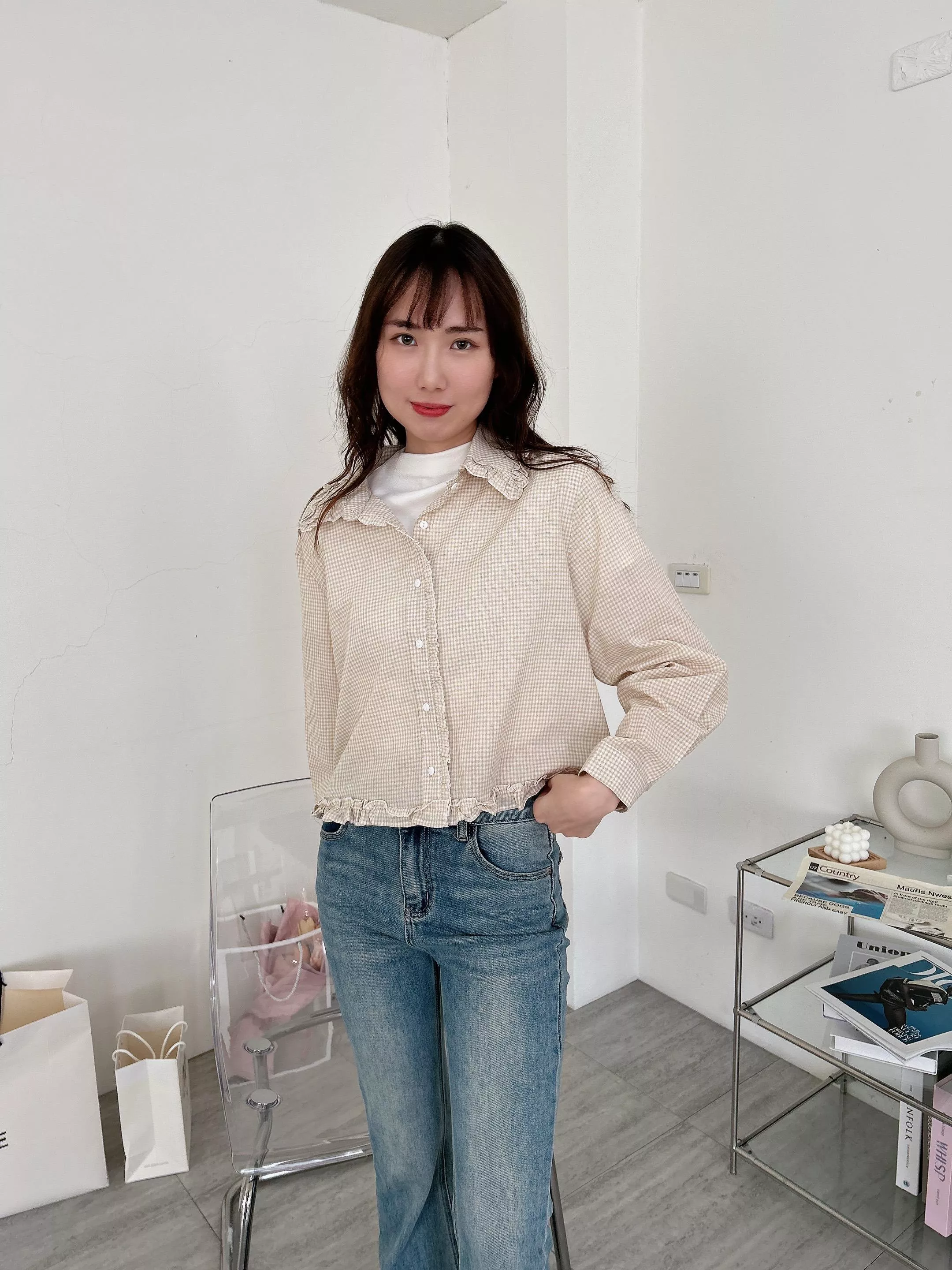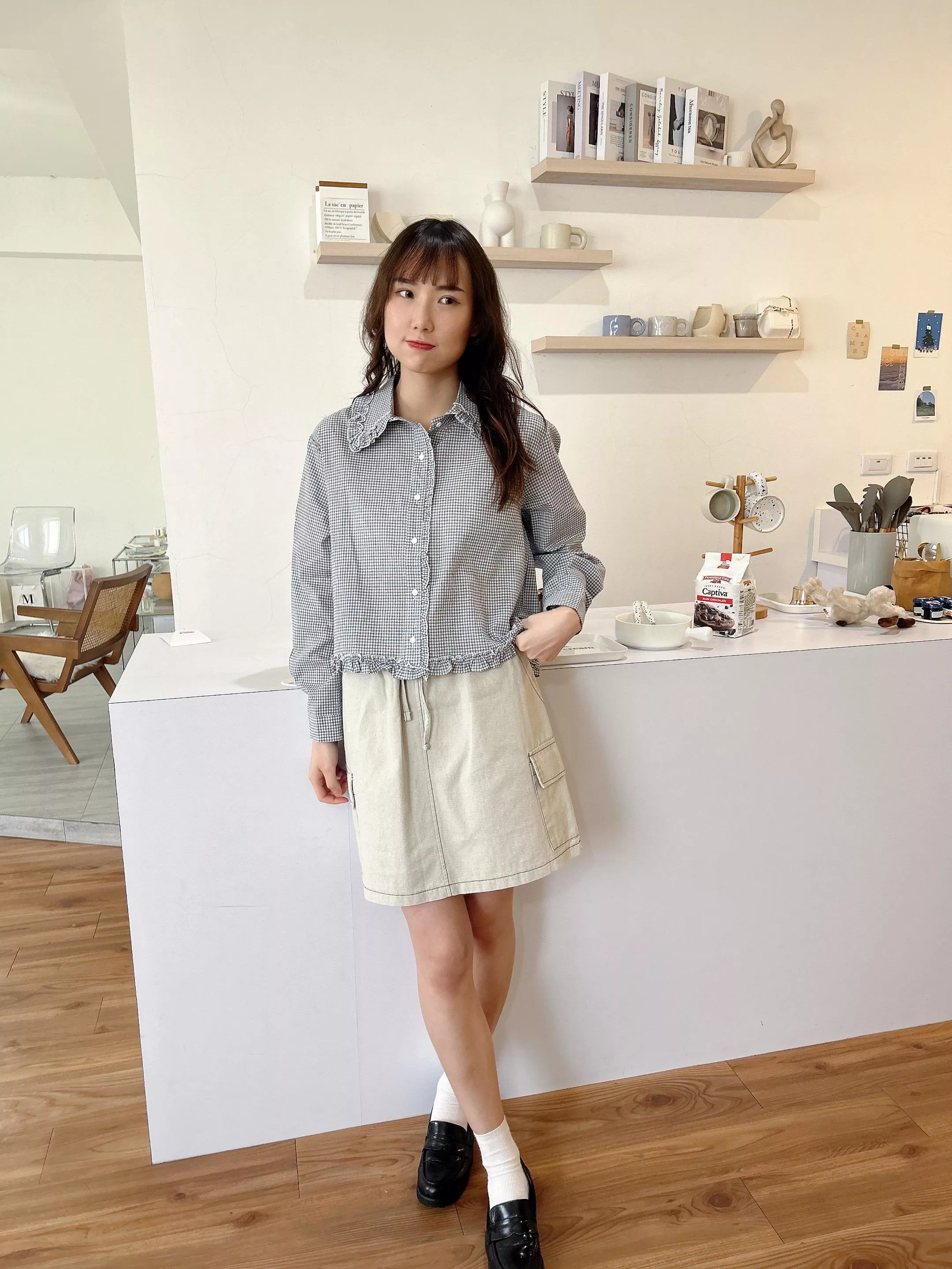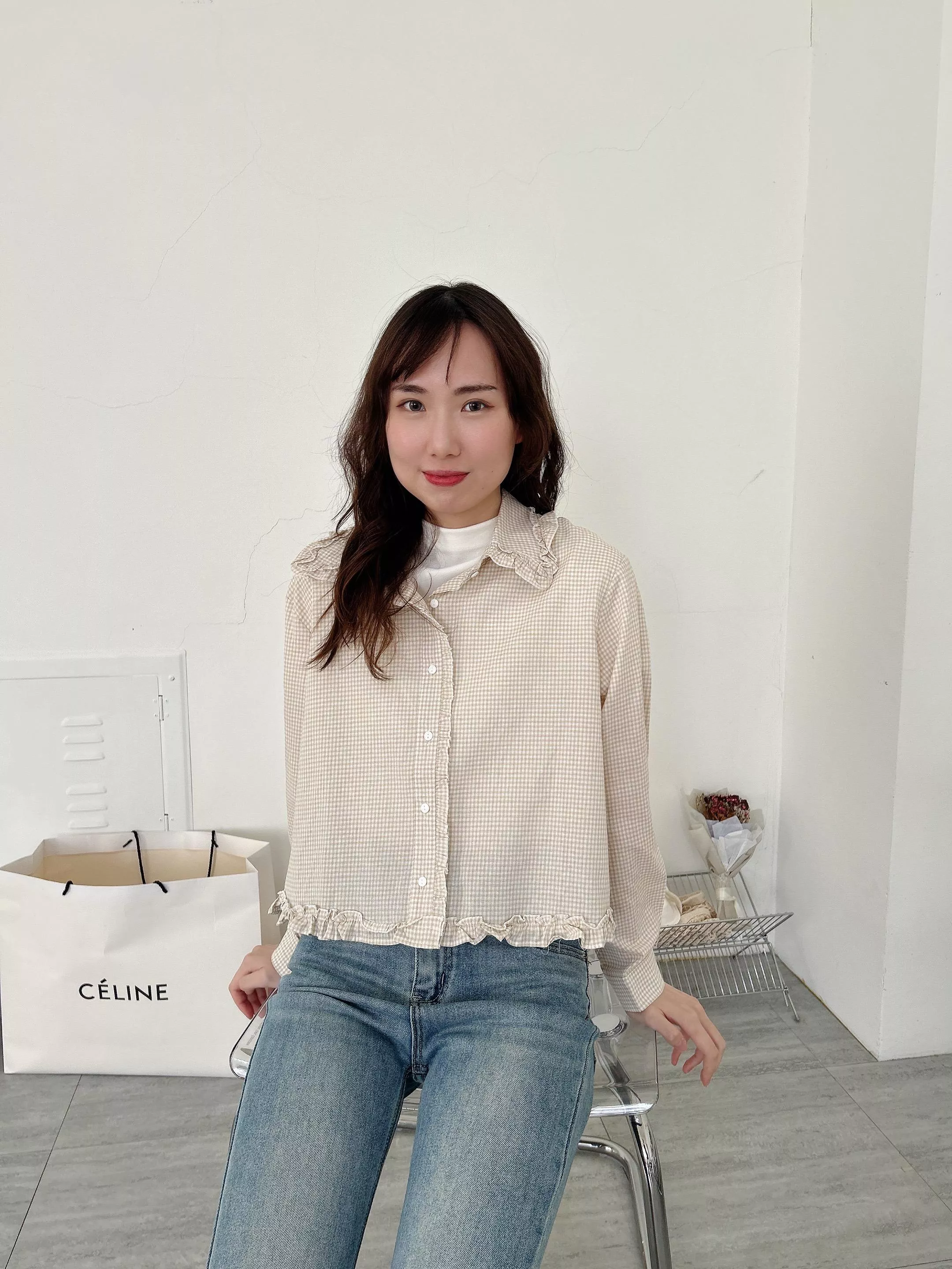 英倫風荷葉邊格紋排釦上衣 (2色)