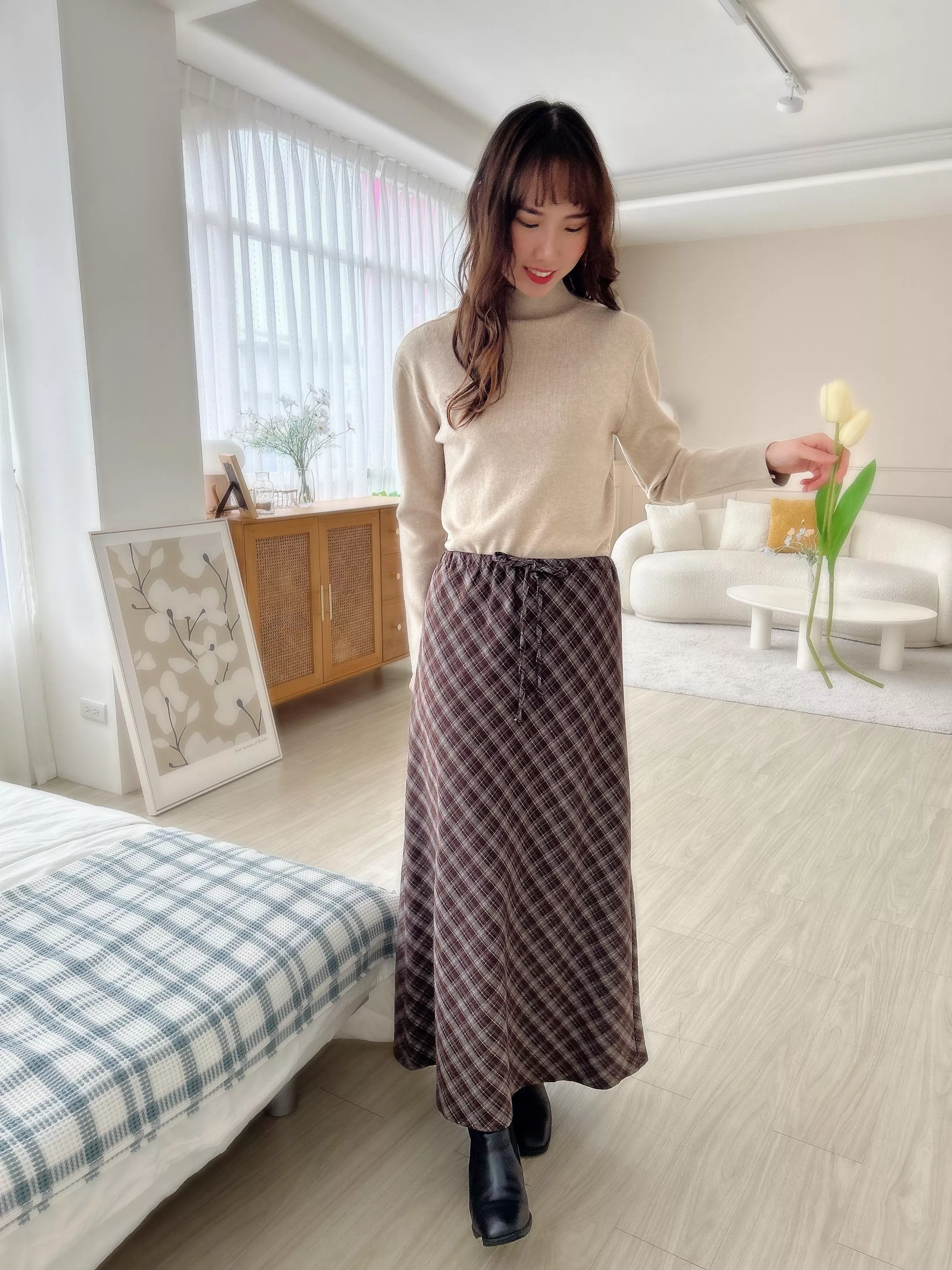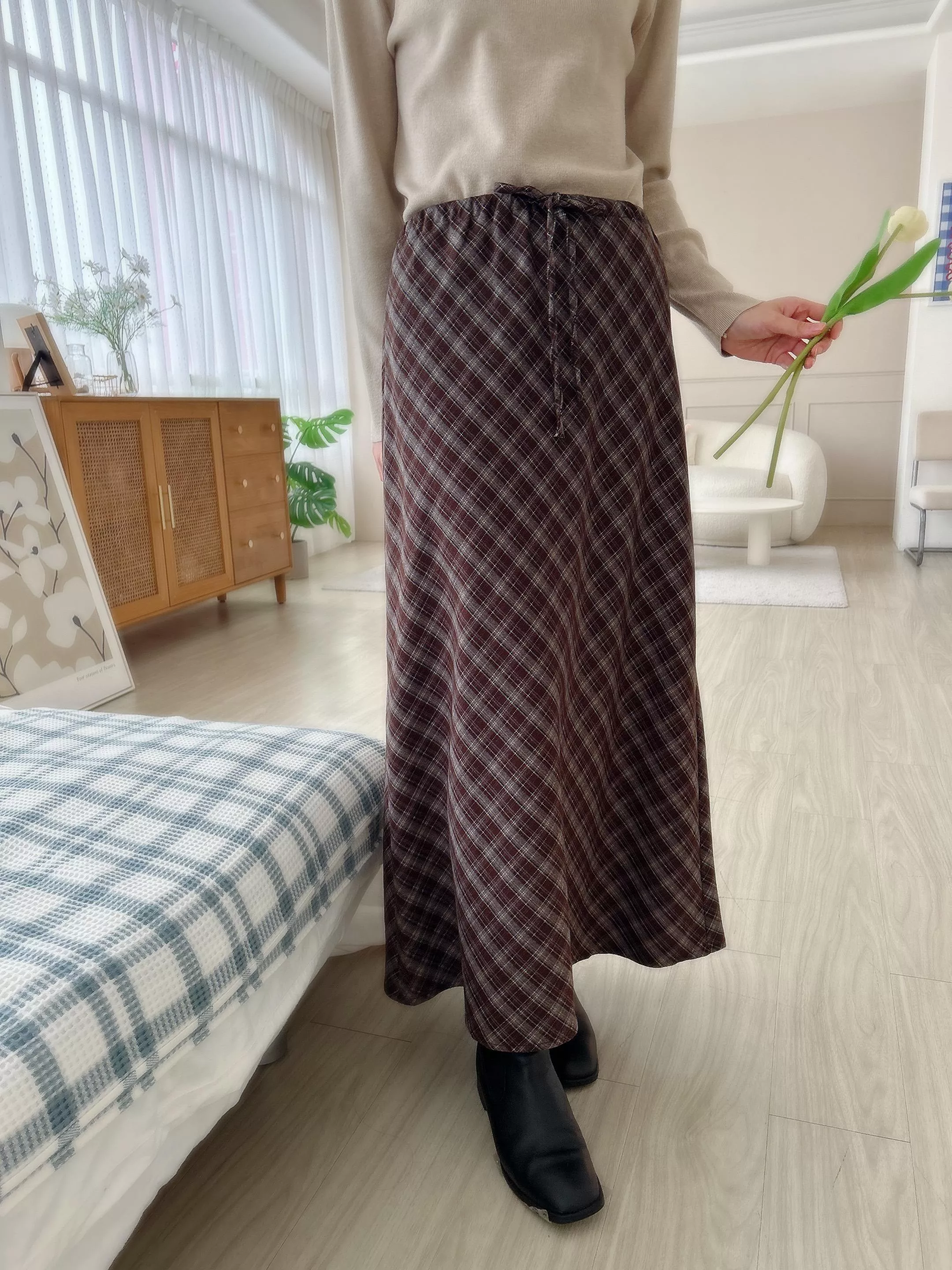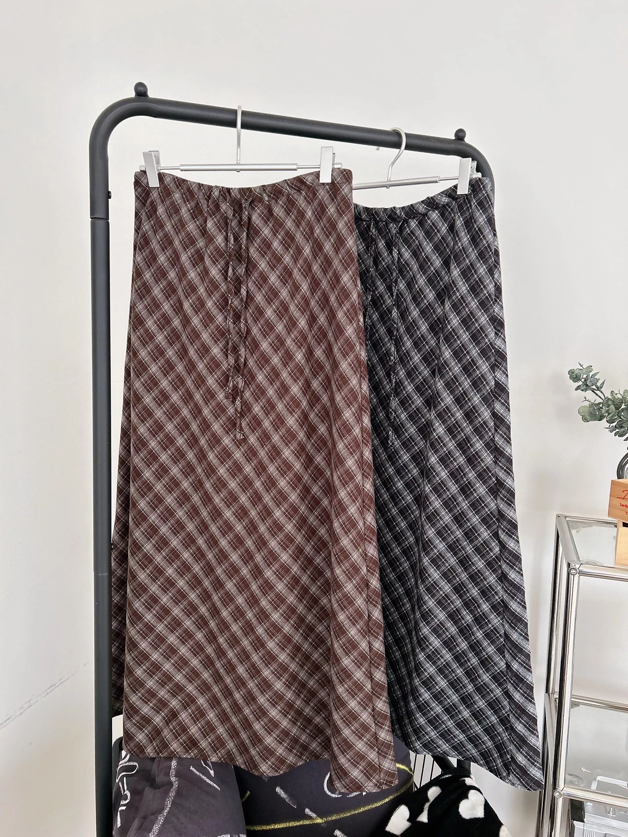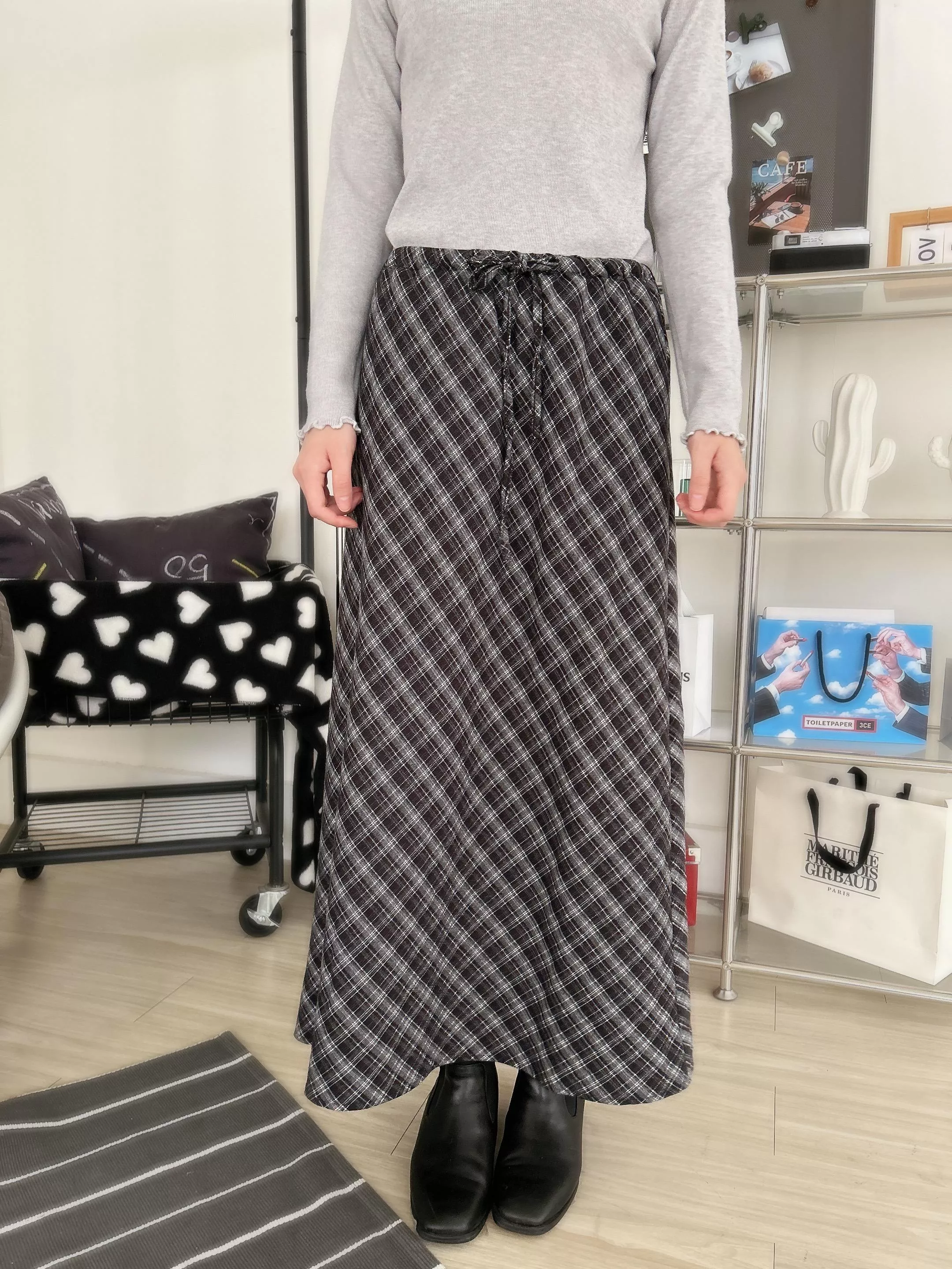首爾學院風磨毛格紋抽繩長裙 (2色)