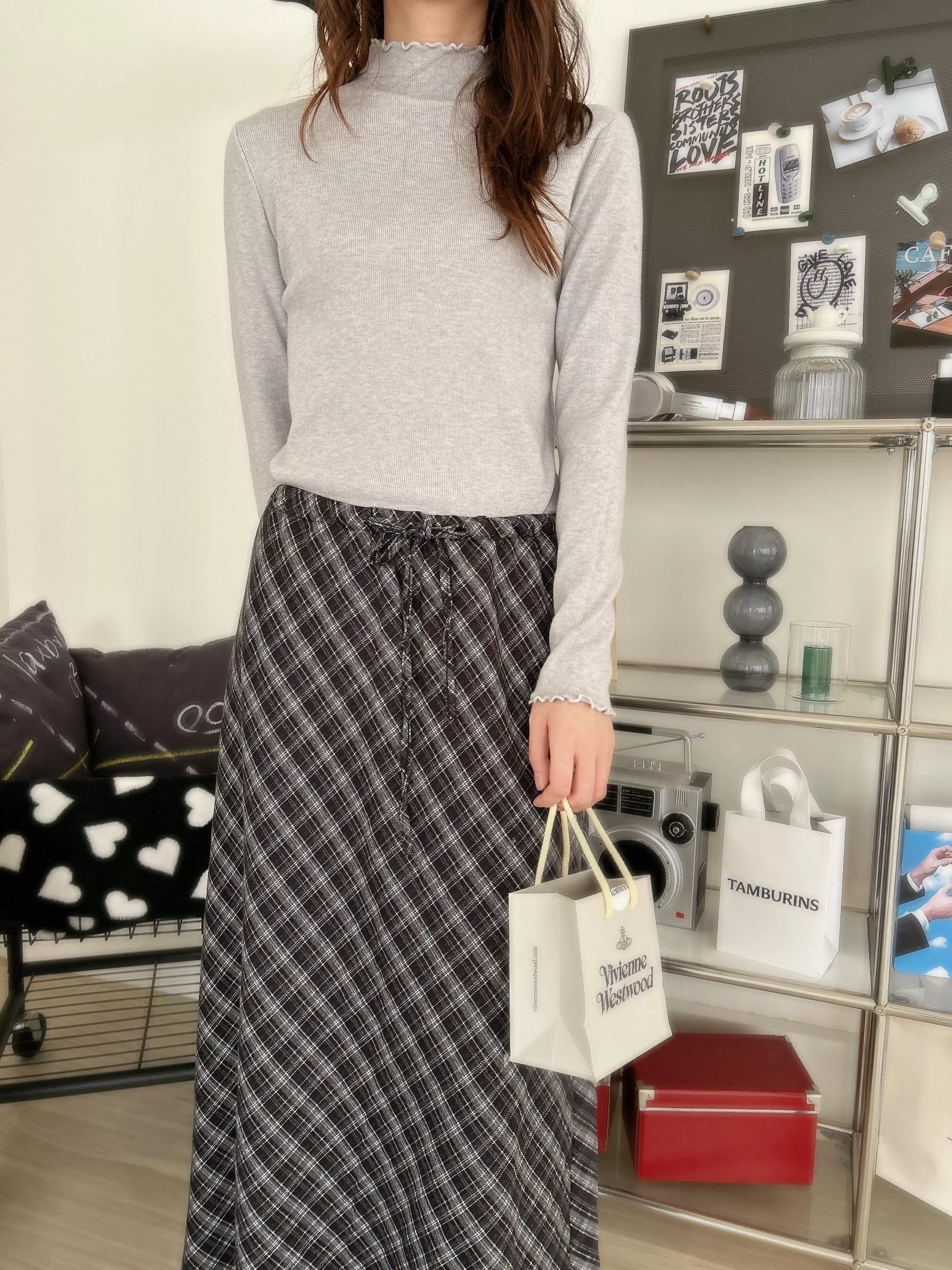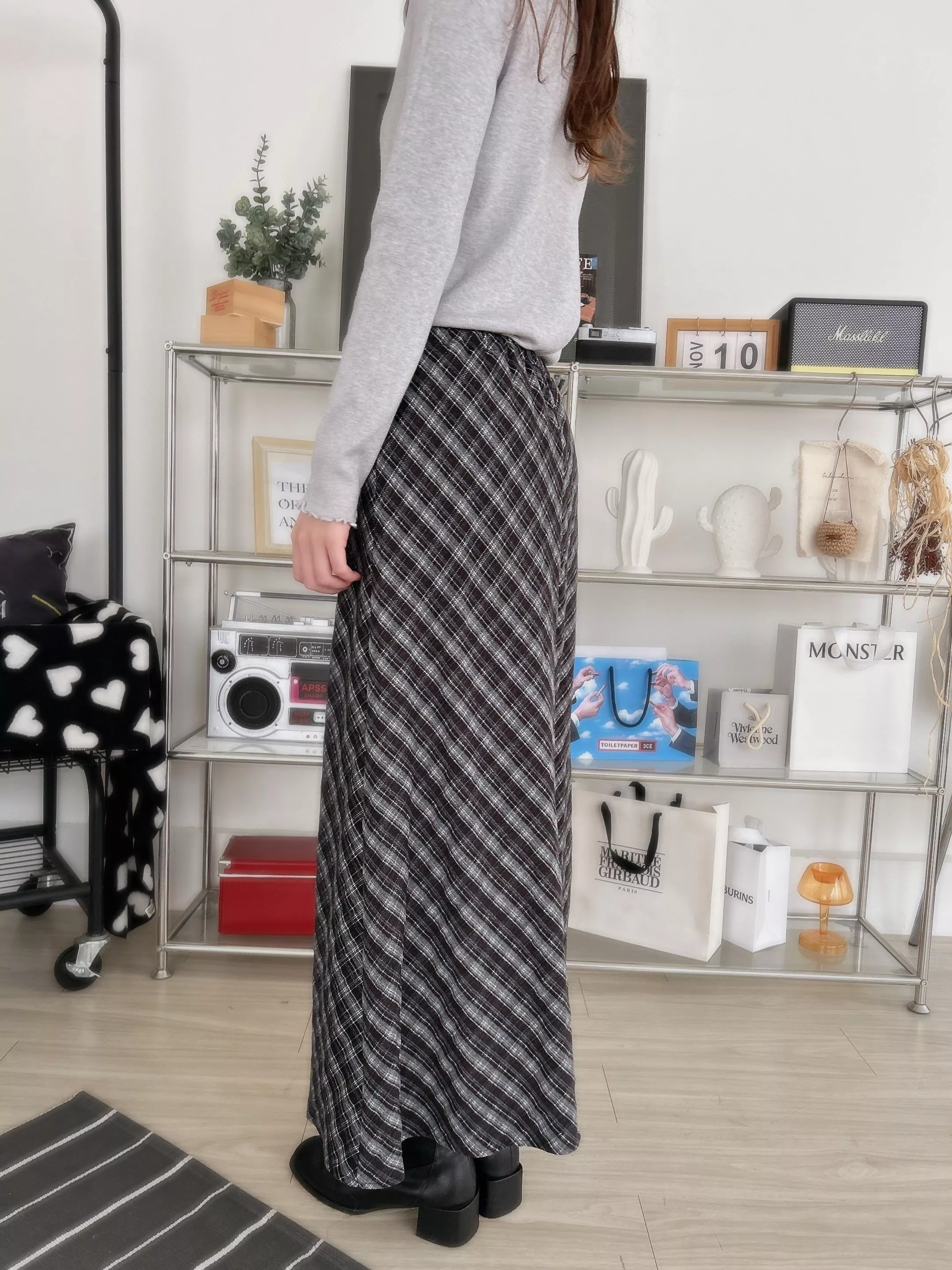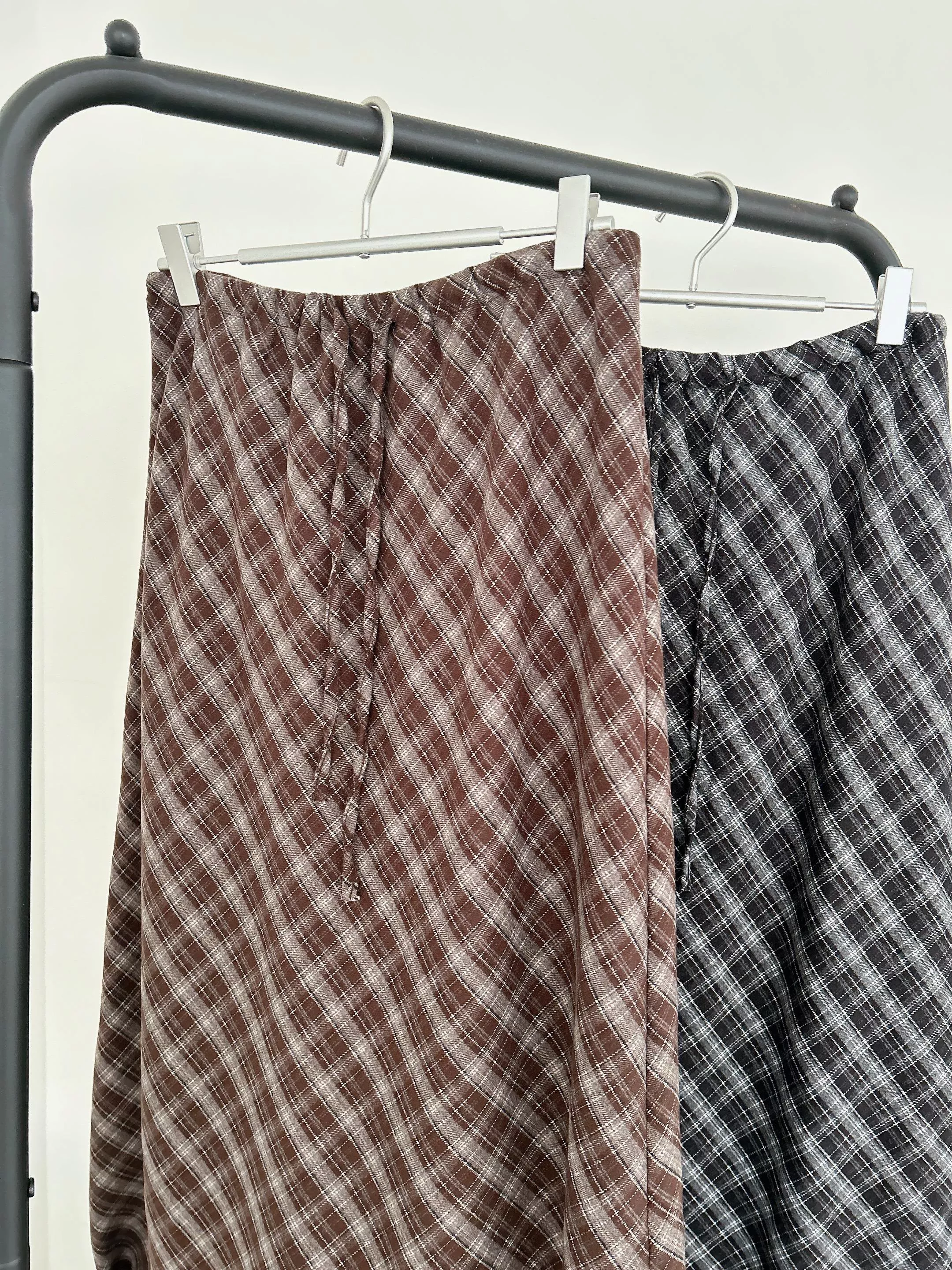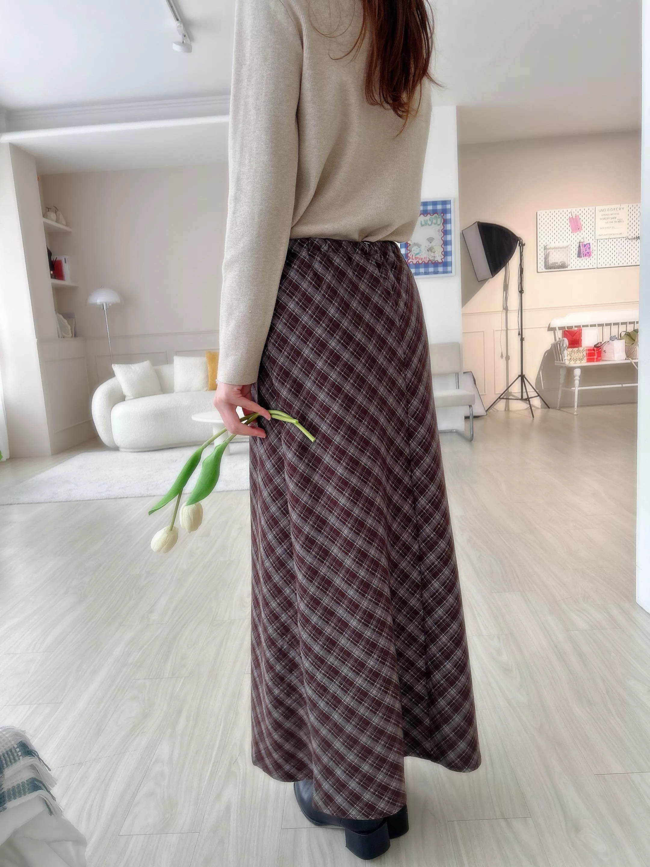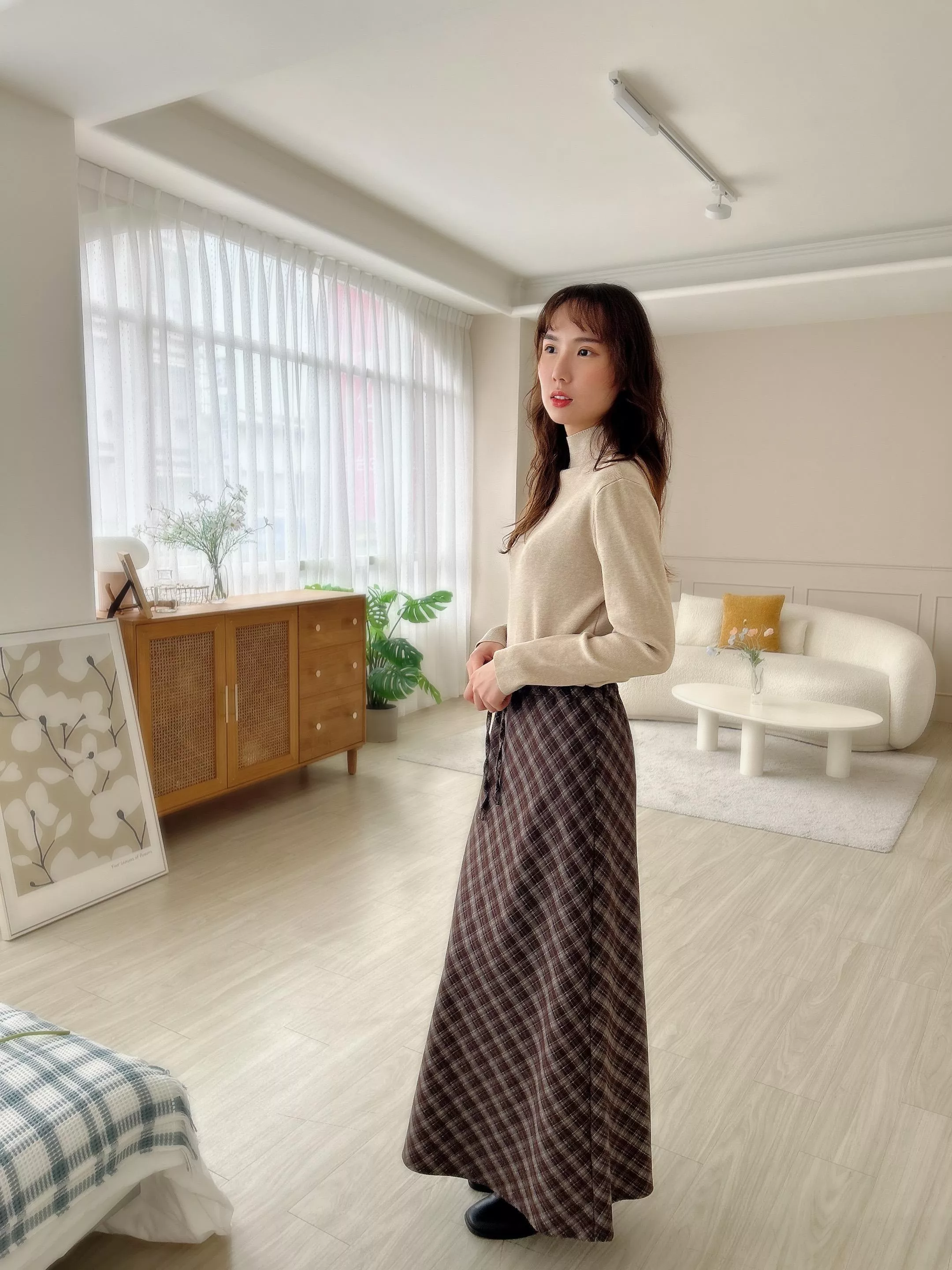 首爾學院風磨毛格紋抽繩長裙 (2色)