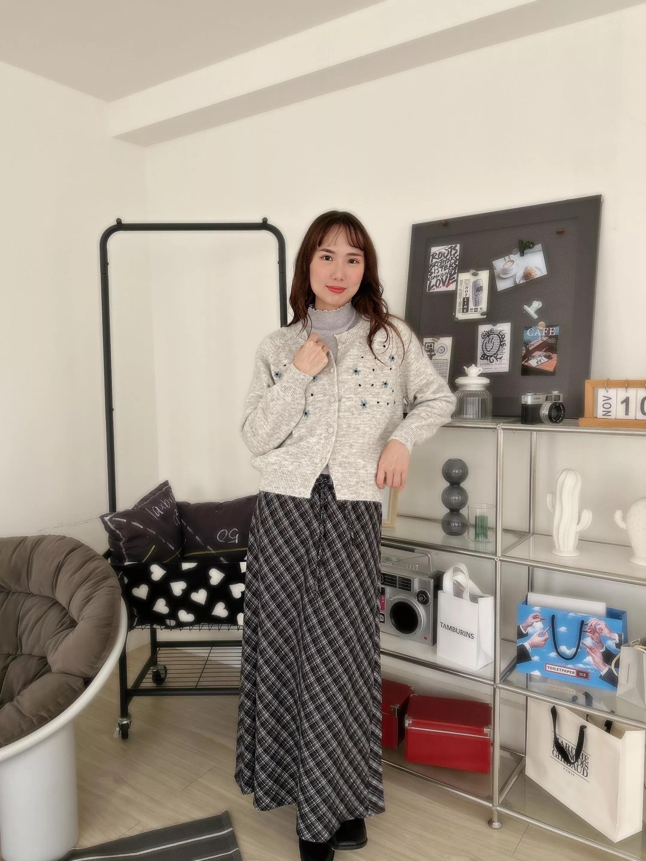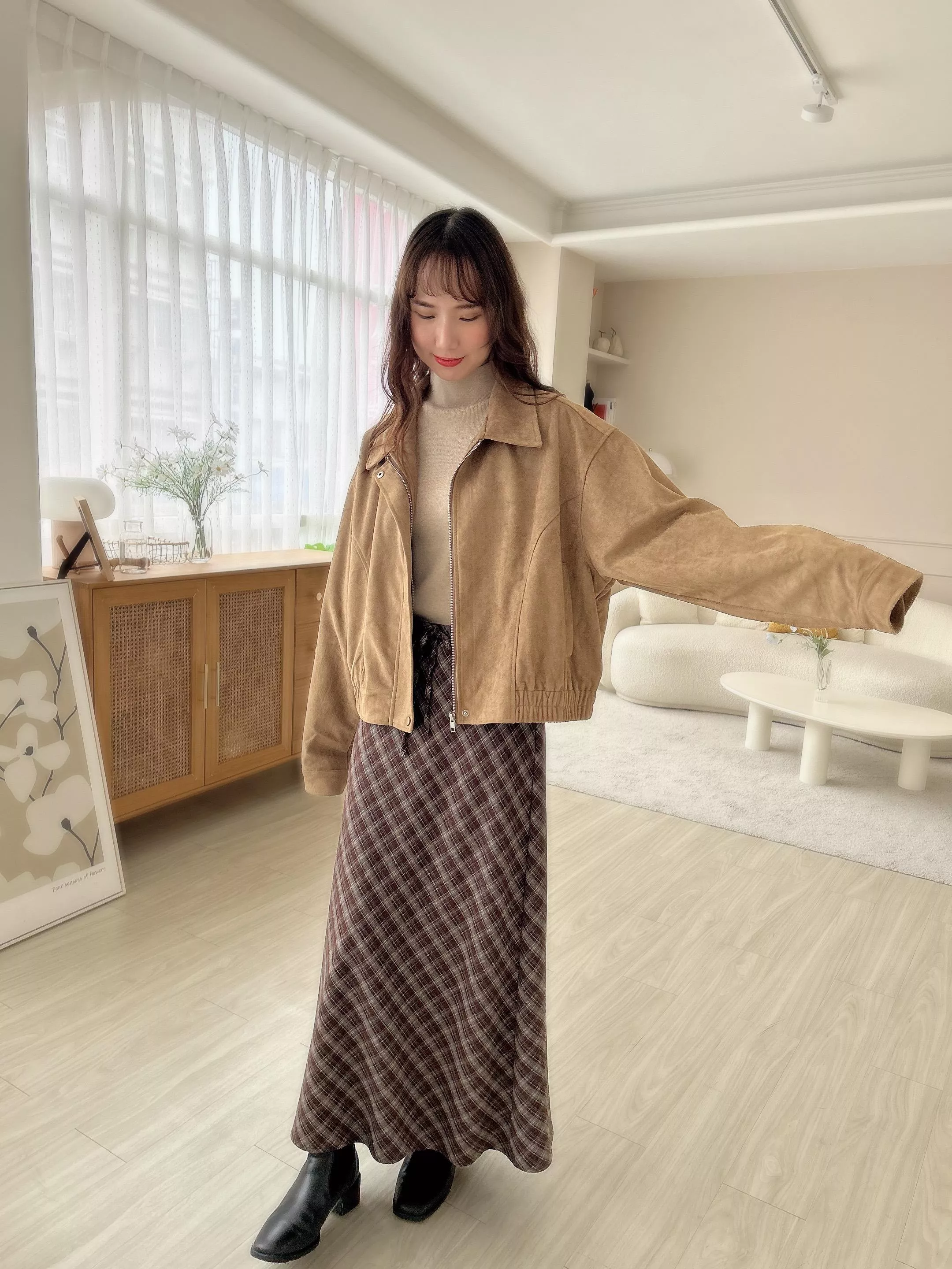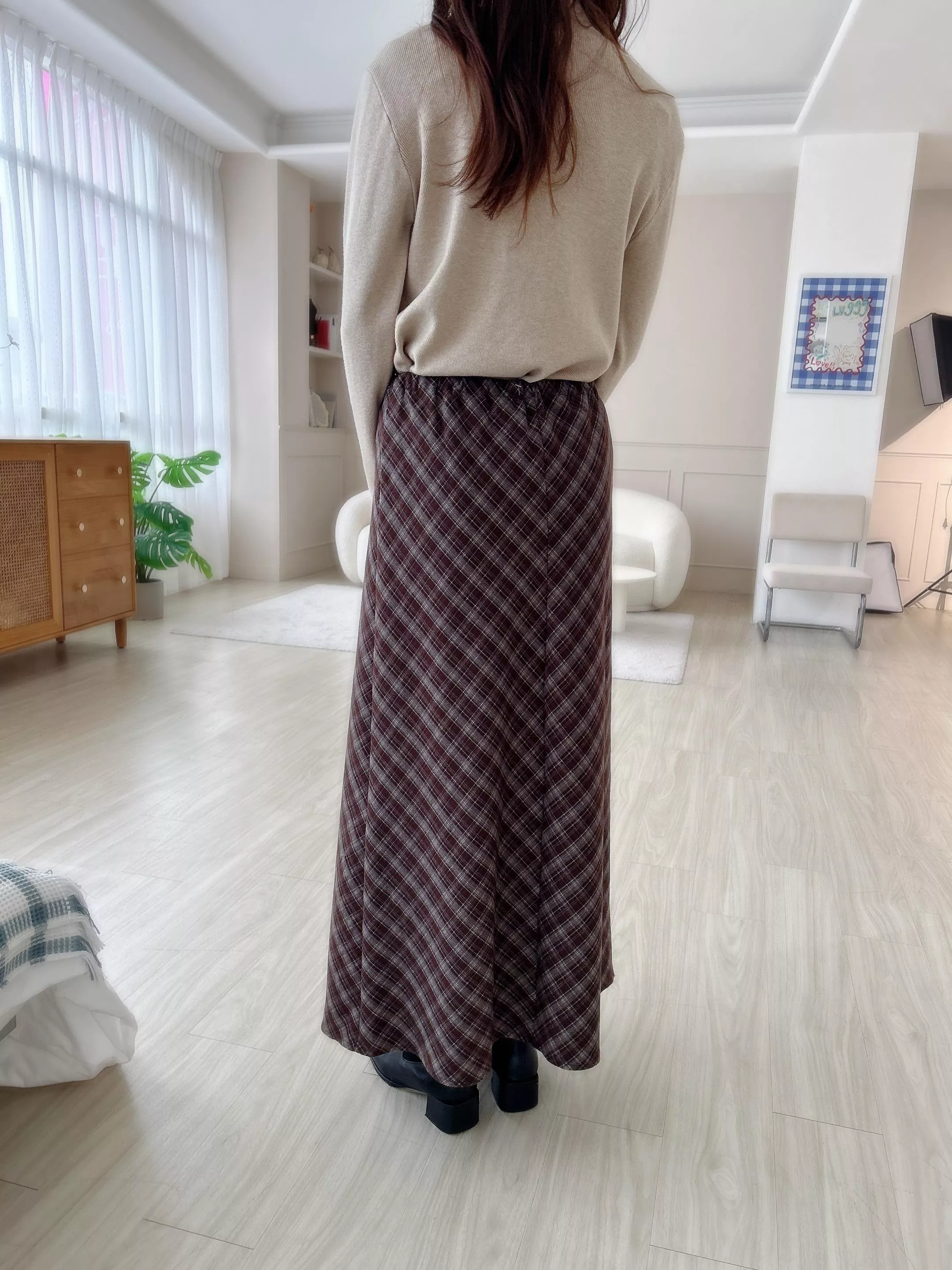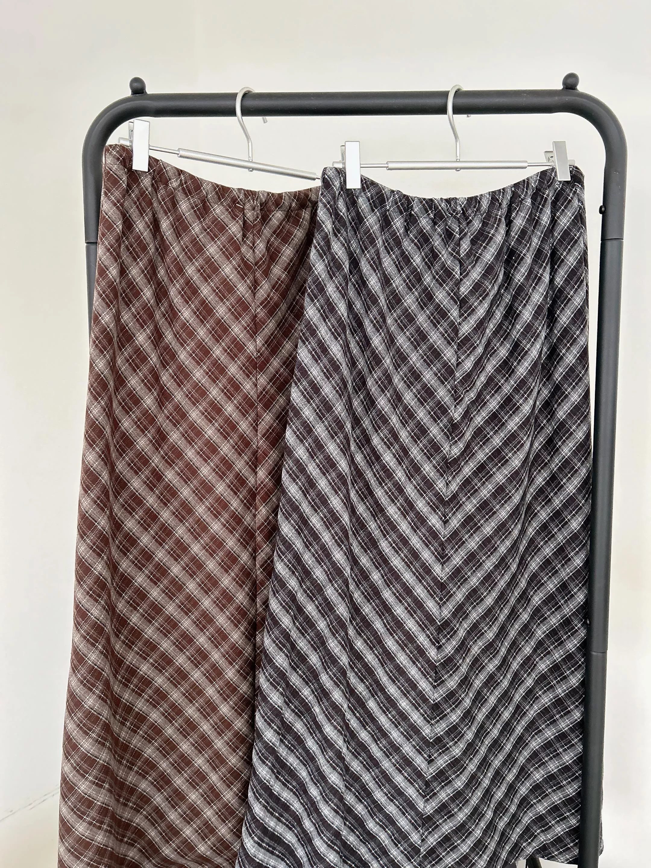 首爾學院風磨毛格紋抽繩長裙 (2色)