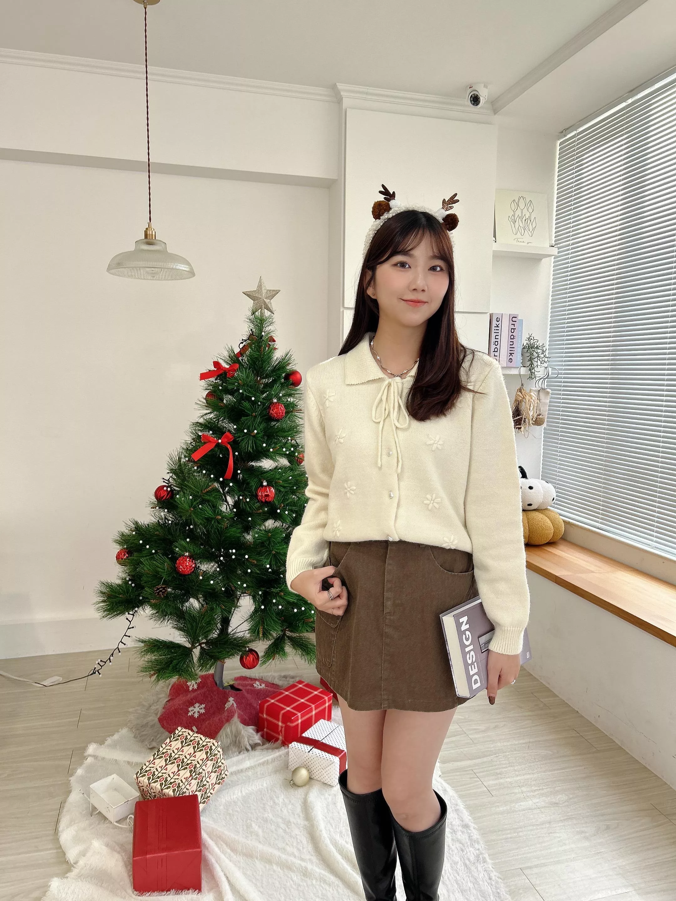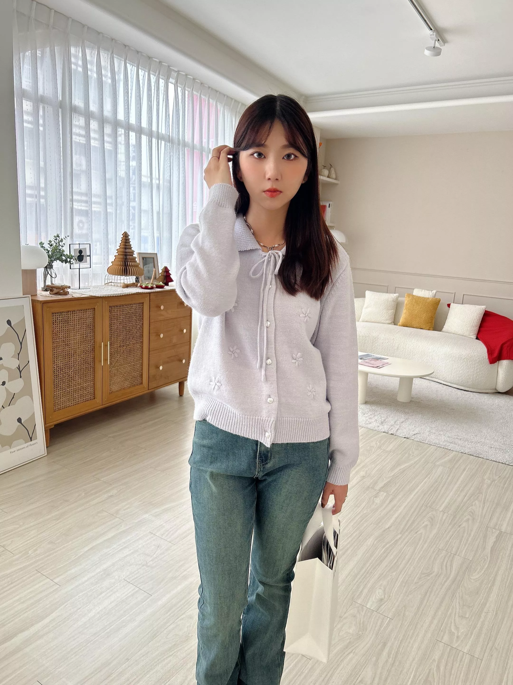 甜美珍珠釦綁帶造型