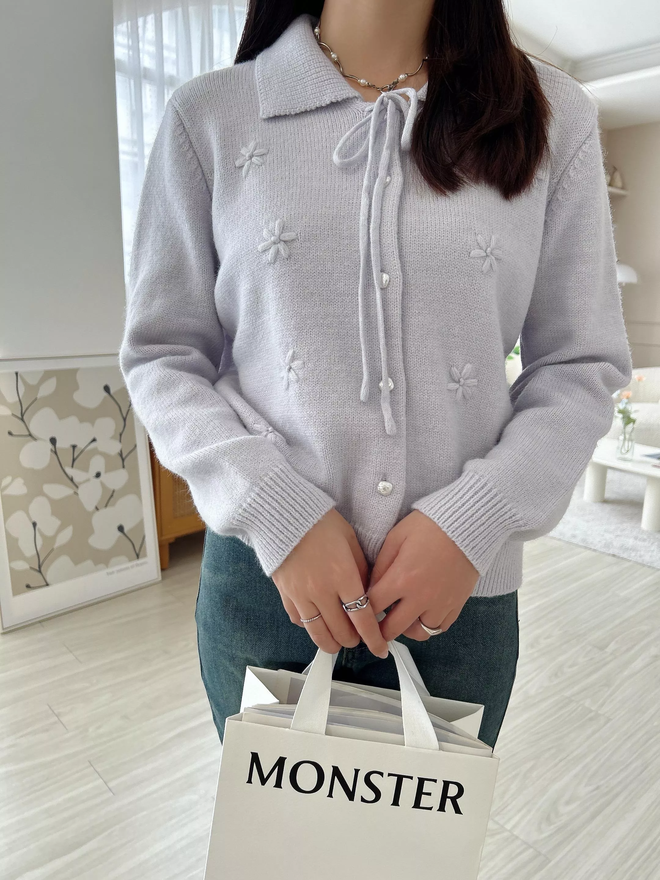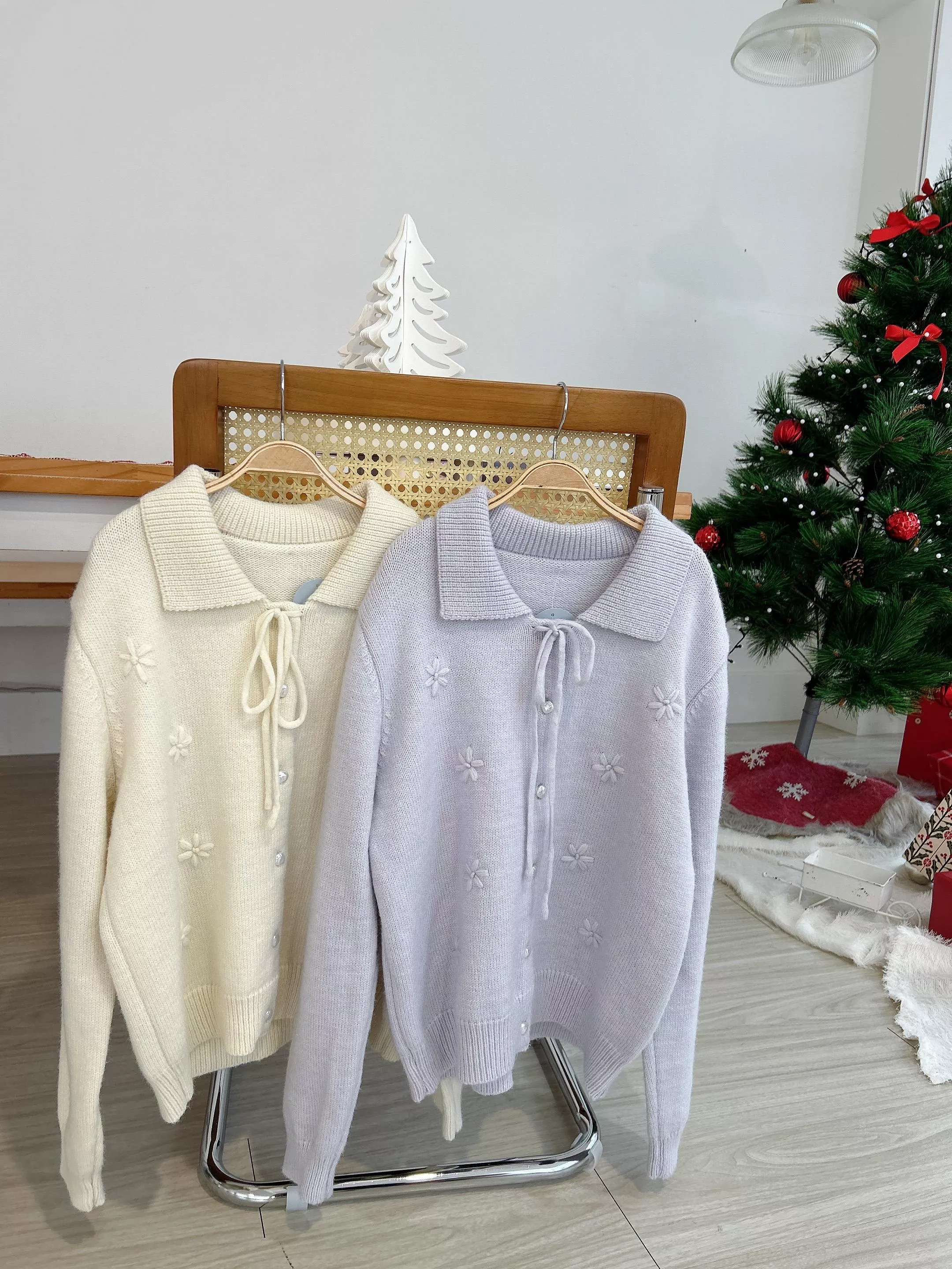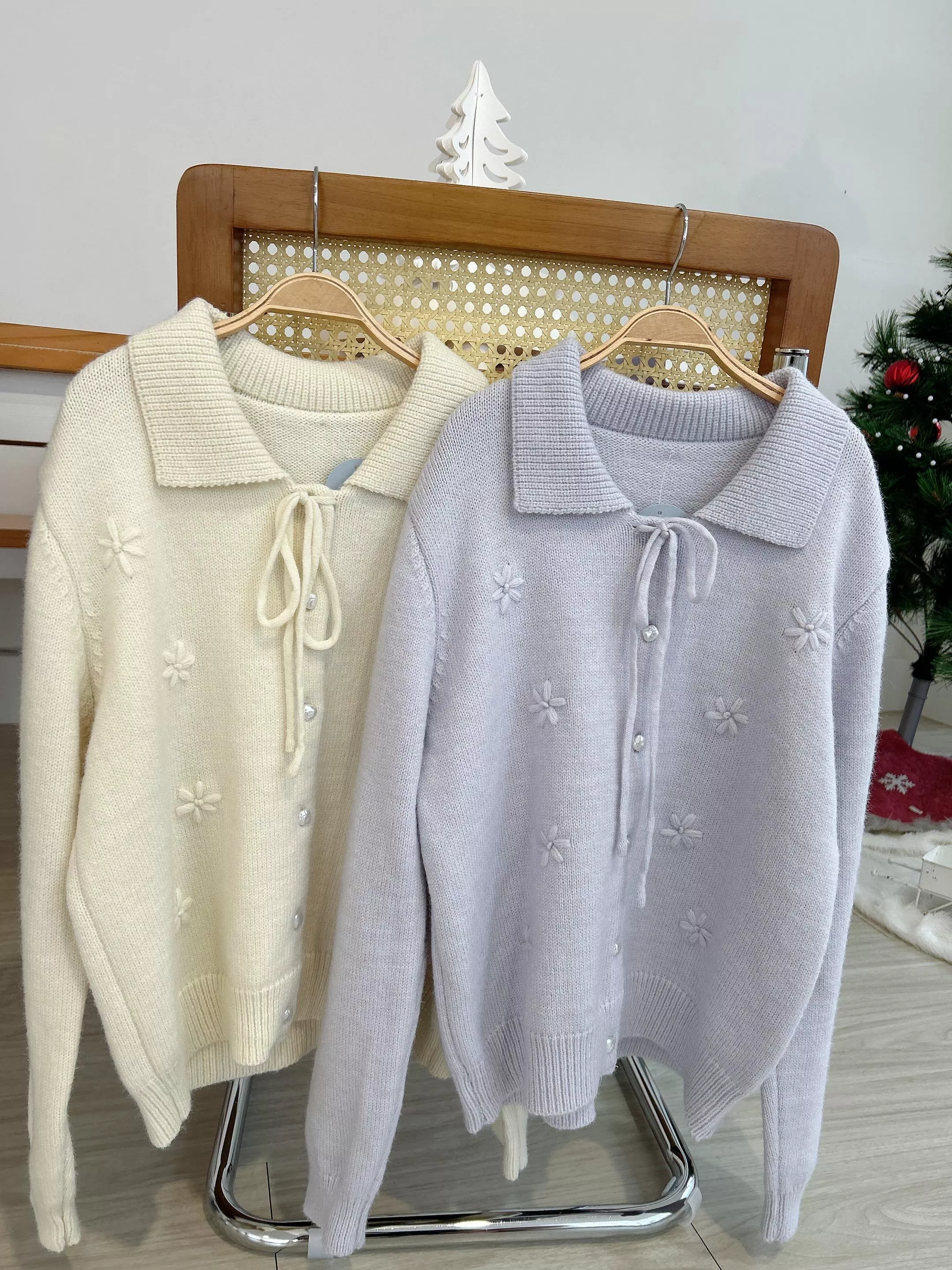 冬日甜心翻領小花刺繡針織衫 (2色)